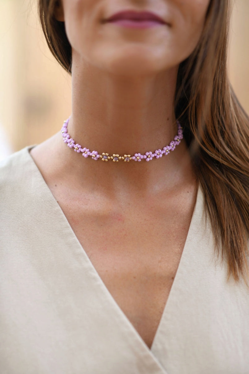 Le collier Élégance présente une combinaison soignée de fleurs et de cristaux de pierres semi-précieuses. Ce design unique et harmonieux sublimera à merveille votre prestance et rayonnera de ses énergies les plus bienfaisantes.